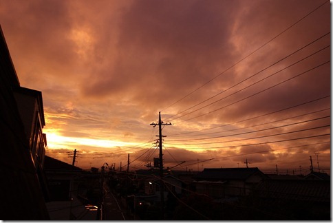 ちょうど雲のスキマから日差しが出て、それにてらされた雲が赤く染まっていました。幻想的ですね。時間があればいつもの場所へ行ったんですが、間に合いそうに無かったのでその場で撮影しました。