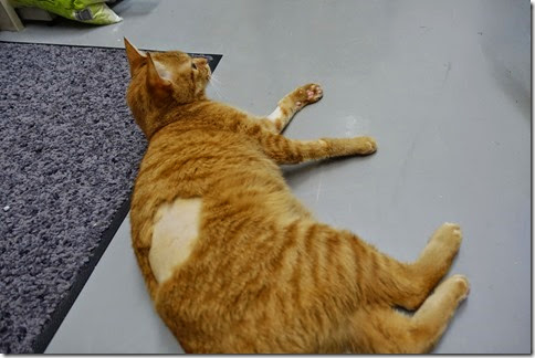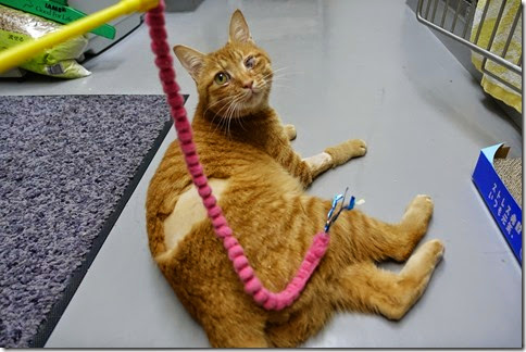 お気に入りの「ねこのきもち」付録のおもちゃで遊んでやりました。剃られた毛がちょっとかわいそうです。